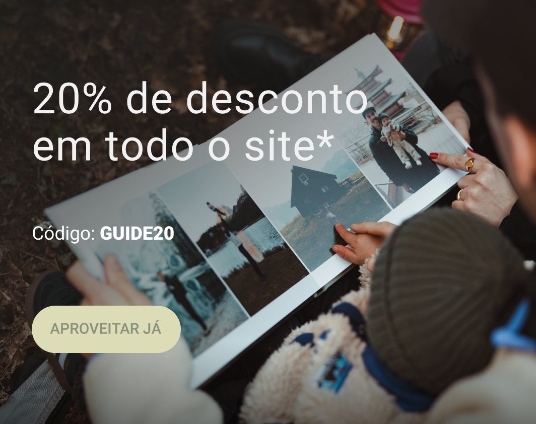 • Promoção “The Life Guide” válida de 19 de fevereiro a 19 de março de 2026. O desconto de 20% é aplicado no carrinho mediante a introdução do código GUIDE20. Para garantir a entrega antes do Dia do Pai, as encomendas de Álbuns devem estar pagas até 09/03. Os restantes produtos (Fotos, Presentes e Decoração) até 11/03. Serviço Fotos 24h sujeito a condições específicas de envio. Promoção limitada ao stock existente. Não acumulável com outras promoções ou códigos em vigor.